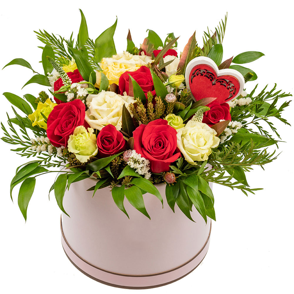 Роза одноголовая красная, эустома белая, рускус итальянский, зелень микс, папоротник. Упаковка (шляпная коробка, квадратный бокс, коробка сердце, оазис)